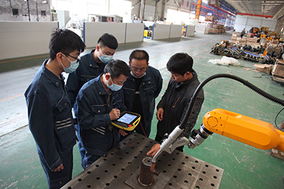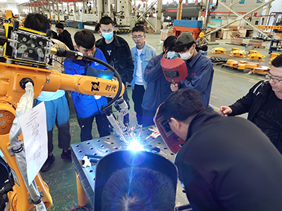 2021年4月26日,北京時代科技股份有限公司組織開設的2021年第一期手工+機器人焊接技能提升班在濟南時代焊接工業園開課了。全部課程為期5天,授課方式為技師現場授課、學員實操焊接練習。本次課程是時代公司精心籌劃的一個提升焊接專業學員機器人操作水平的培訓課。授課老師均為時代公司高級焊接技師。培訓設備為時代6公斤弧焊機器人、時代PNE61-400氬弧手工兩用焊機,時代全數字TDN 5001MB氣保焊機、A160-350半自動氣保焊機等。參加培訓的學員全部為國內職業院校系統內的年輕學員和教師。本次培訓內容主要以實際操作為主,焊接理論為輔。實操內容包括焊條電弧焊、熔化極氣體保護焊、鎢極氬弧焊和機器人熔化極混合氣體保護焊等。