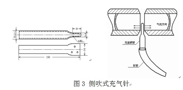 采用圖1 所示的充氬裝置,但將充氣針設(shè)計成圖3所示,即將原充氣針端部焊接密封,而在兩個側(cè)面分別鉆3個φ2mm的小孔,讓氬氣從兩個側(cè)面向氣室送氣。同時對焊接工藝進(jìn)行調(diào)整:打底焊接時保留充氣針部位不焊,隨即進(jìn)行蓋面層焊接,最后取出充氣針,焊接層次封口。