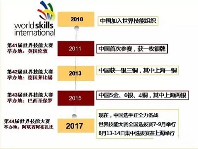 2017年10月,第44屆世界技能大賽將在阿聯(lián)酋阿布扎比舉行,中國(guó)代表隊(duì)擬參賽項(xiàng)目共45個(gè)。2016年7月至9月,第44屆世界技能大賽全國(guó)選拔賽全面拉開帷幕。8月13日至14日,將在上海世博展覽館1號(hào)館舉行全國(guó)選拔賽集中選拔賽!